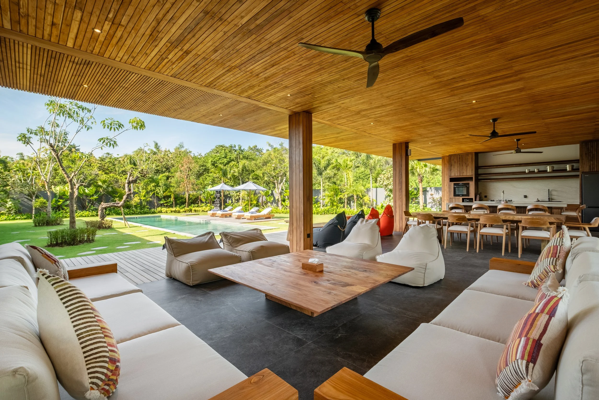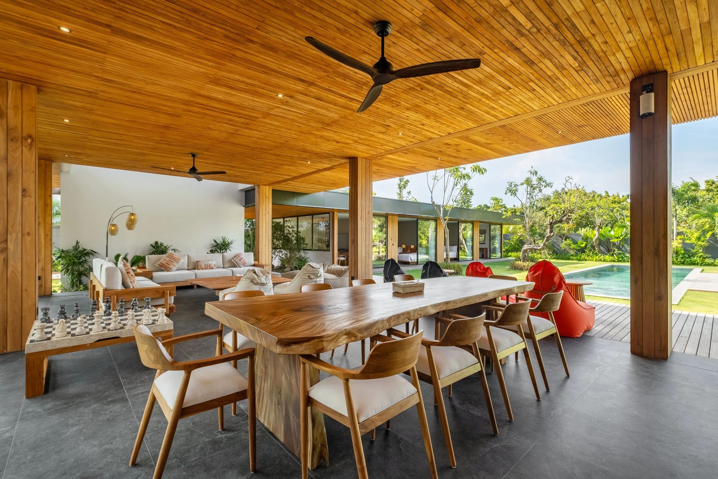 The villa is thoughtfully arranged around a striking linear pool which serves as the centerpiece of both daily life and social gatherings. The open alfresco dining areas invite leisurely meals under the tropical sky while spacious indoor living areas provide a comfortable retreat for quiet moments or shared experiences.